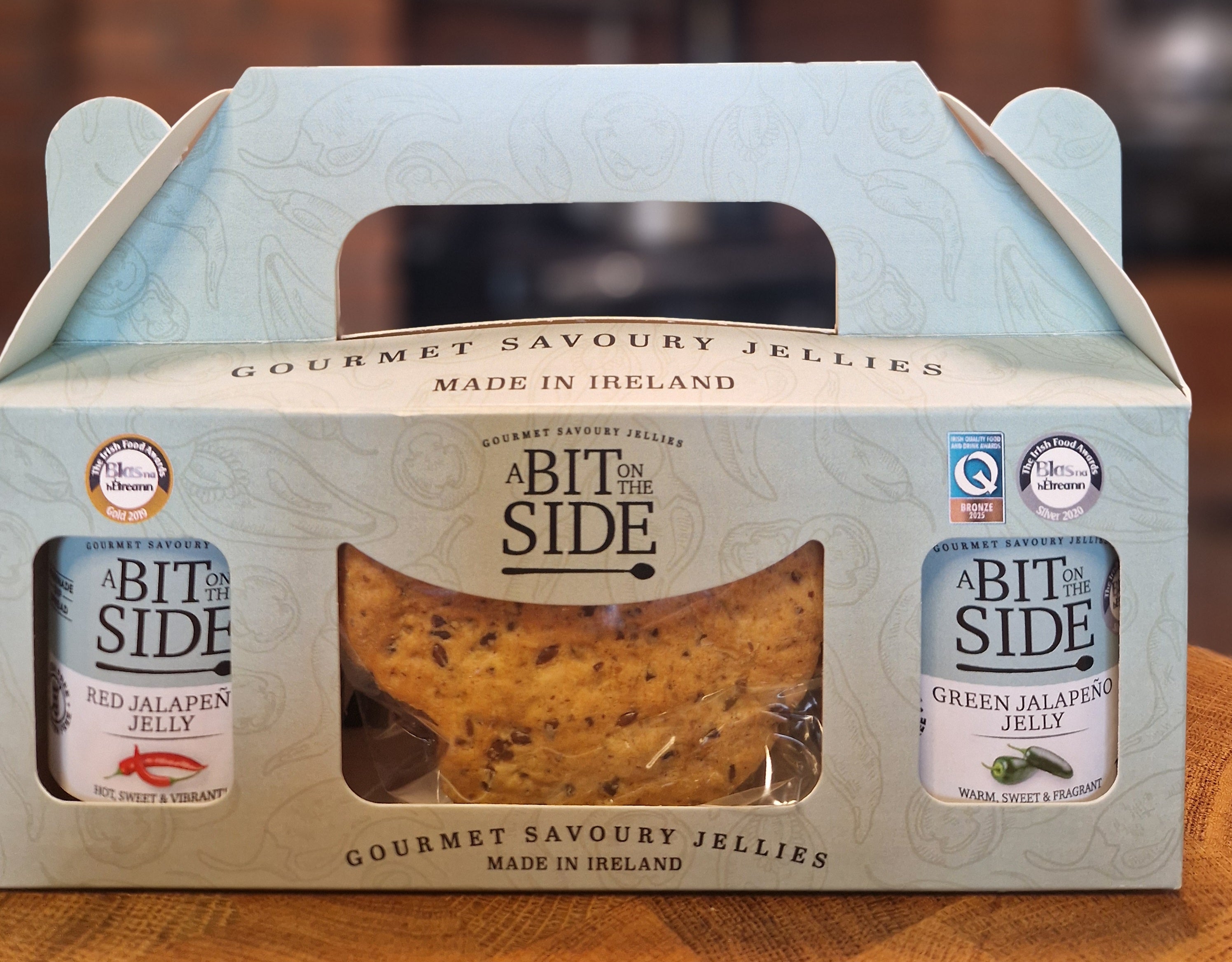 Our top sellers, Red and Green Jalapeno Jelly, together with delicious Flax Seed Crackers in a lovely carry gift pack.